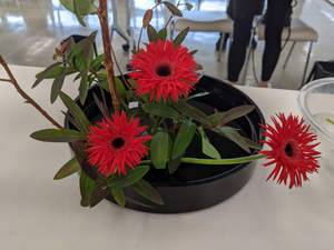 On the small table in front of me sits my very first Ikebana, crafted in a class I took one week ago. The branches curl up, sprouting tiny leaves in defiance of the cuts that separated them. Bright red gazenias droop in the night, then straighten up to face another day. Beauty, grace, life - they tell me - is temporary. But it's still real. Still worth doing.