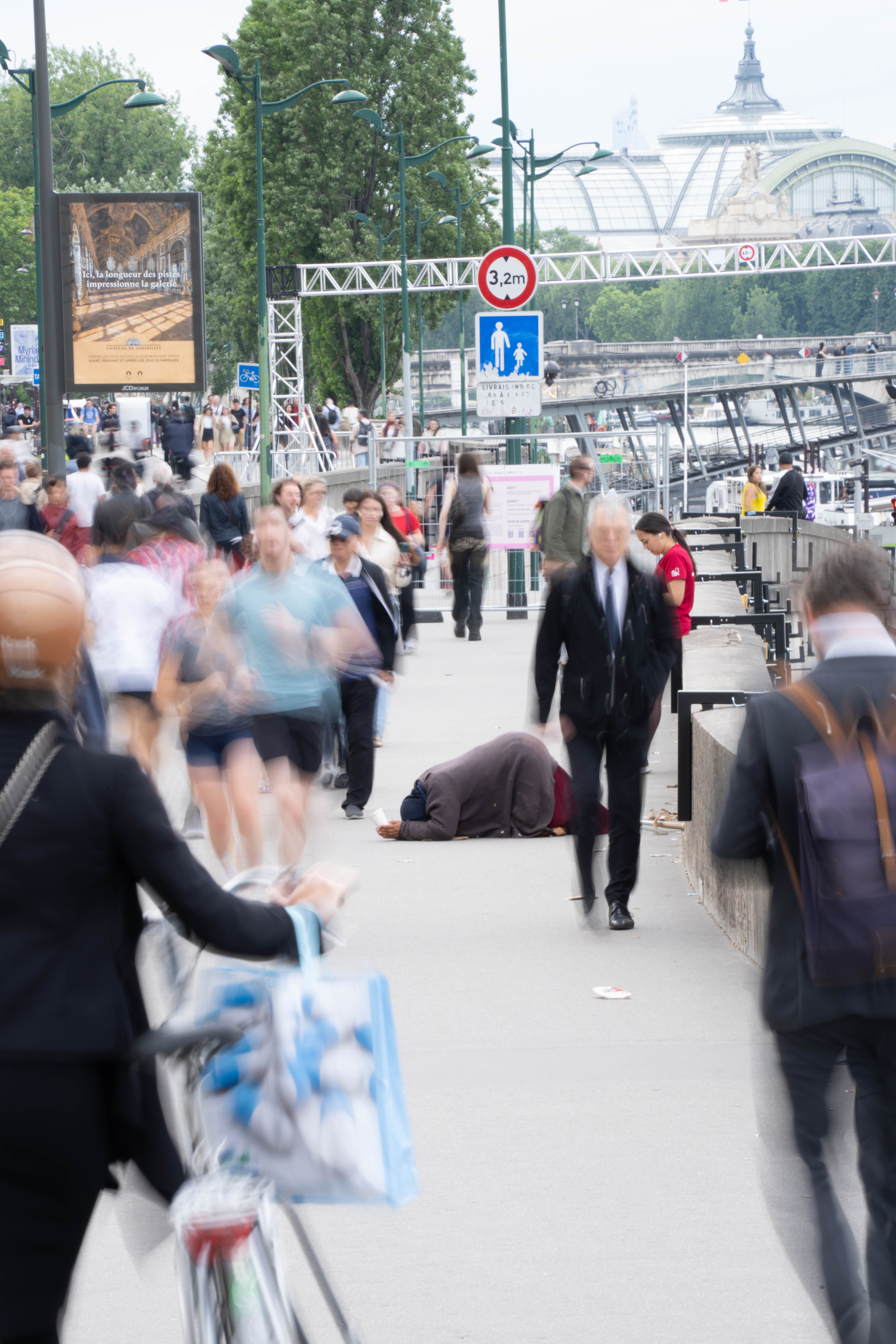 It's the brutality of the footstrike, inches from someone's head. The wide space around that says this was a choice. The contrast between someone running for pleasure in fancy gear with knees and elbows pressed into concrete. The terrible knowledge, passing between.